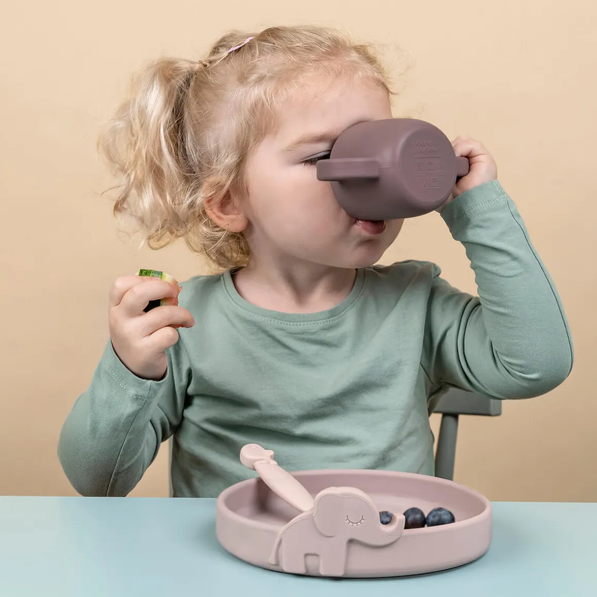 Les enfants apprécieront que les adorables animaux se joignent à eux à l’heure du repas – ils découvriront Croco au fond de leur tasse lorsqu’ils boiront et Elphee et Wally les aideront à franchir l’étape excitante qui consiste à manger tout seul. L’ensemble est dans des tons doux de Rose.
