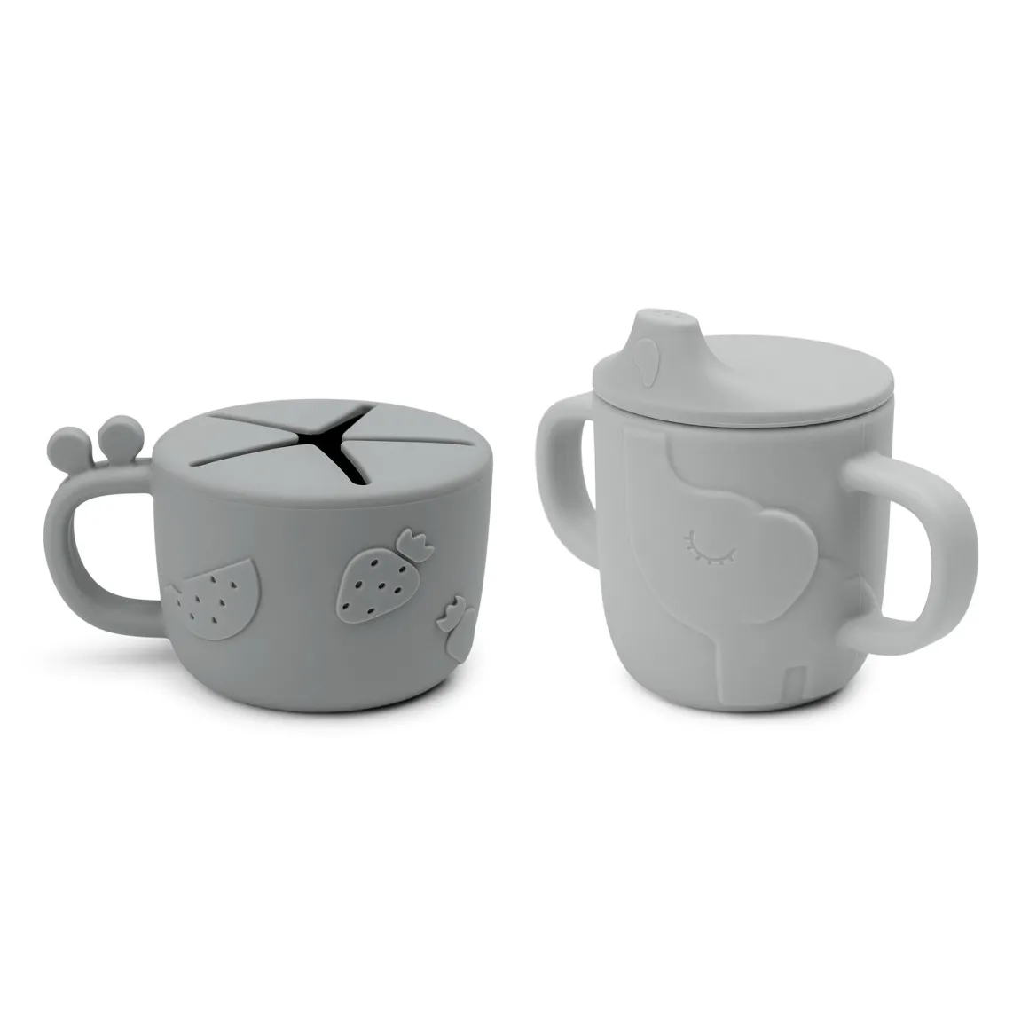 L’ensemble de tasses grises avec la girafe et l’éléphant est fabriqué en silicone alimentaire, ce qui le rend incassable et lui confère une bonne prise en main.