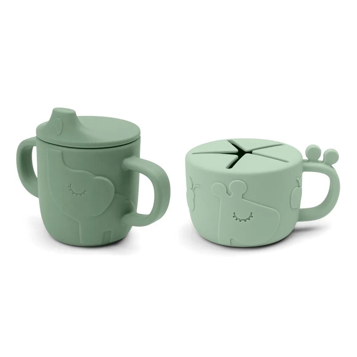 L’ensemble de tasses vertes avec la girafe et l’éléphant est fabriqué en silicone alimentaire, ce qui le rend incassable et lui confère une bonne prise en main.