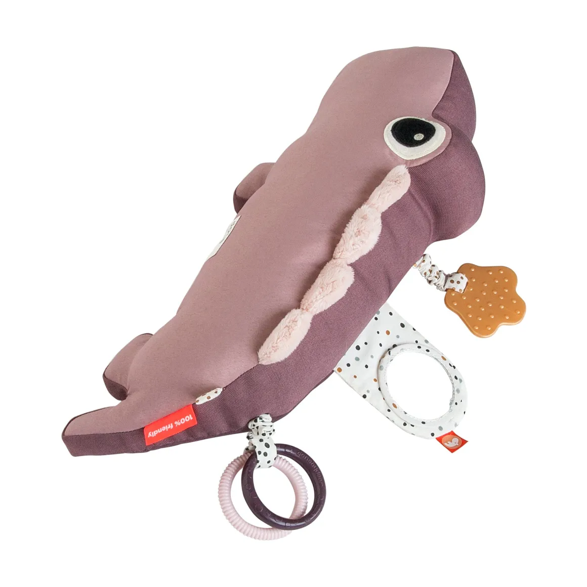 – Avec un anneau de dentition, des anneaux pour apaiser les démangeaisons des gencives, des textures tactiles, un petit miroir, des rubans, des bruits de froissement et un ventre de crocodile qui s’agite.