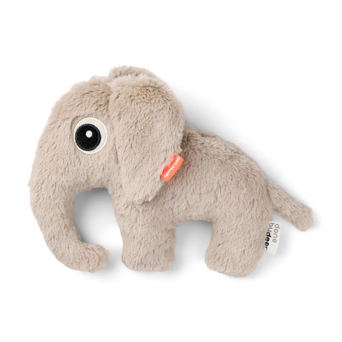 La peluche est douce et poilue. Un adorable éléphant de couleur sable.