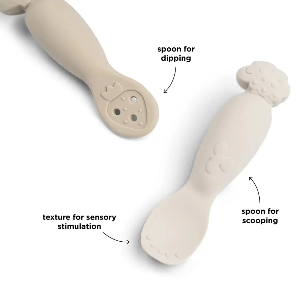 Soft spoons designed for your little one to explore food at their own pace. With one spoon for dipping and one for scooping, the shapes and textures are perfect for tiny hands to grasp and use.