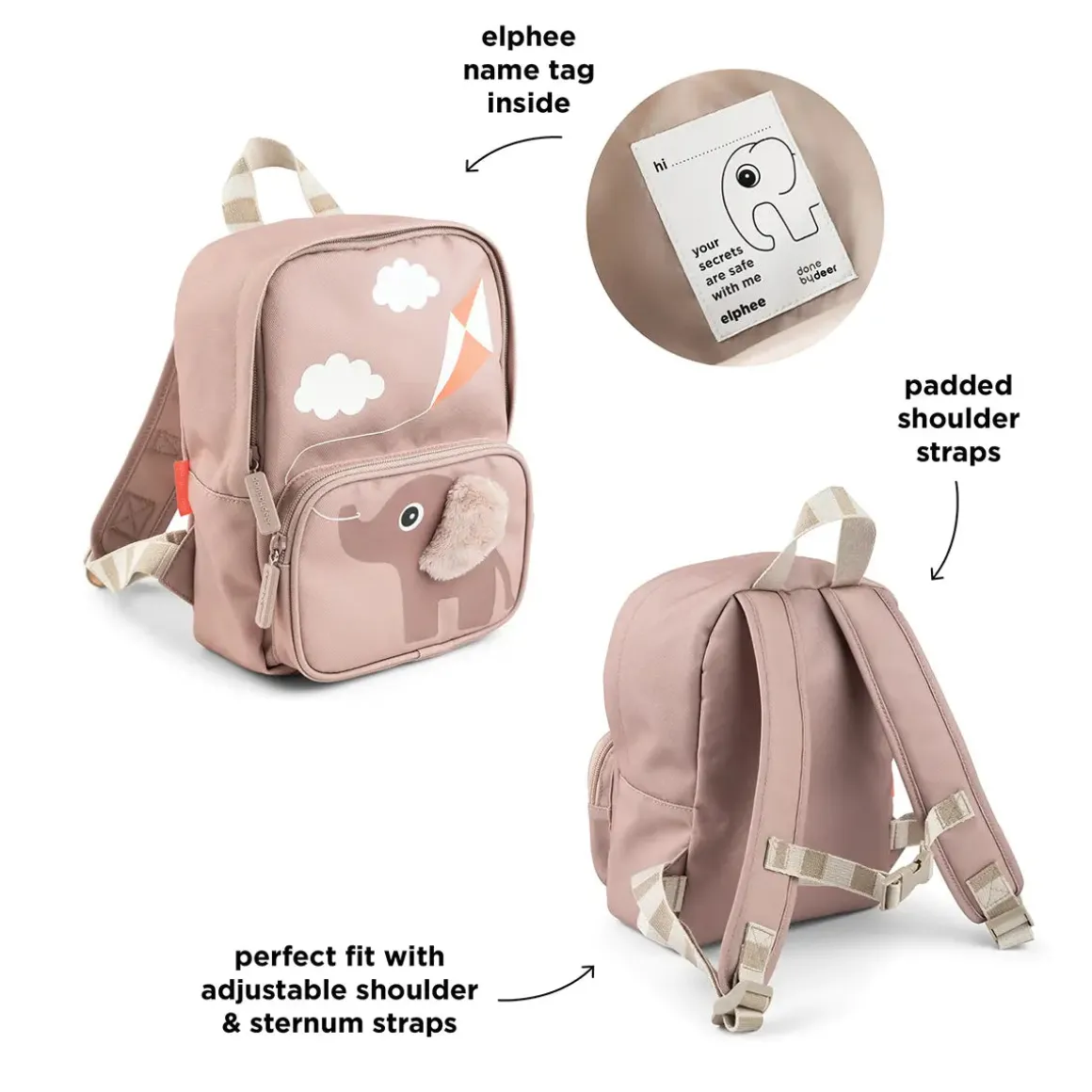– Mignon sac à dos pour enfants de couleur poudrée avec un motif d’Elphee faisant voler un cerf-volant