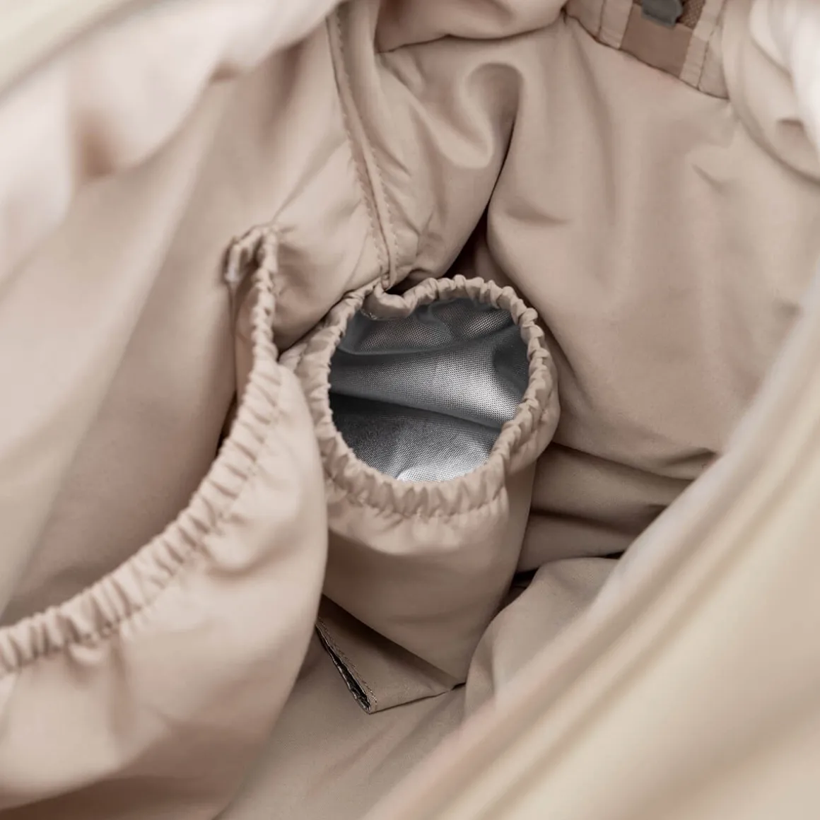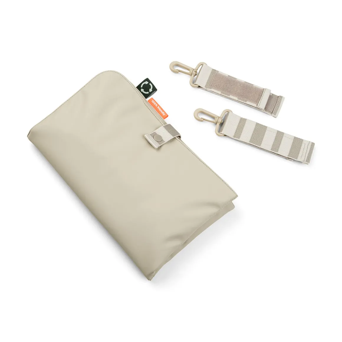 Le sac à langer et le matelas à langer molletonnés sont conçus dans une jolie couleur sable. Les sangles extérieures permettent d’attacher facilement le sac à la poussette. Le matériau de surface est facile à lingette en tissu.