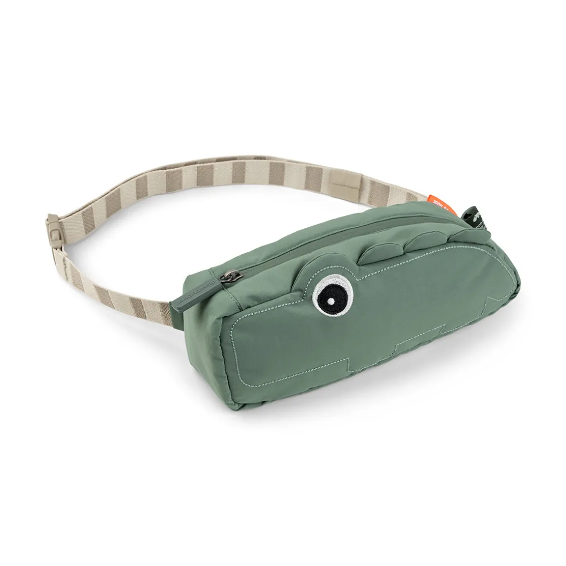 Le sac a la forme du Croco, des rubans de crocodile sur le dessus et un badge amusant à l’intérieur. Le sac résiste aux intempéries et est fabriqué en polyester recyclé à partir de 5 gourdes PET usagées. La fermeture éclair étanche permet de l’ouvrir facilement.