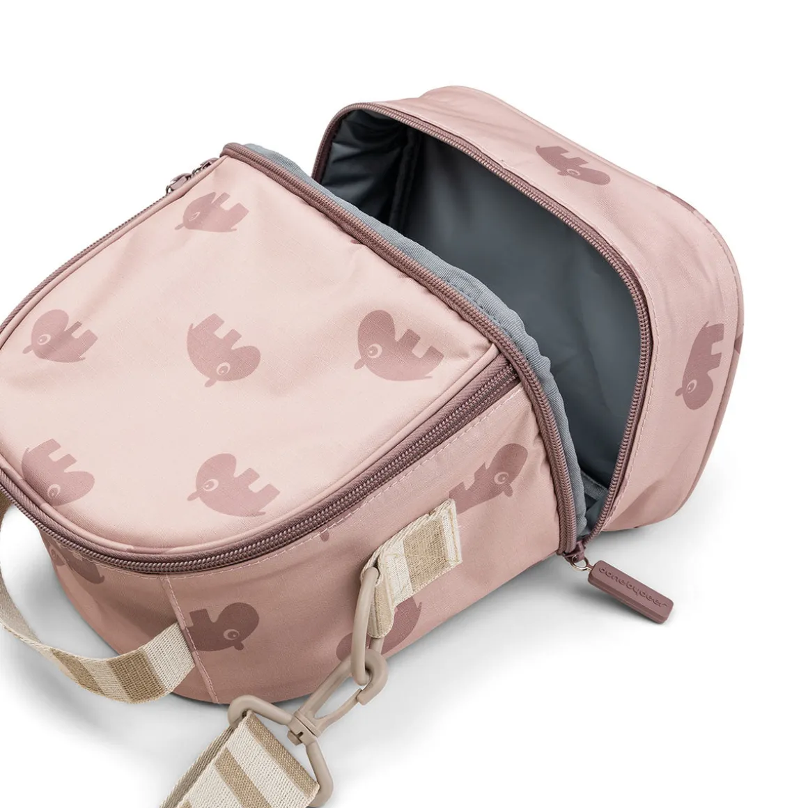 Le sac isotherme a été conçu dans une belle couleur rose avec un imprimé d’Ozzo, l’hippopotame, sur tout le pourtour. La poignée et la bandoulière sont ornées de bandes sable signées Done by Deer. Le tissu durable et résistant aux intempéries se nettoie facilement avec un chiffon humide.