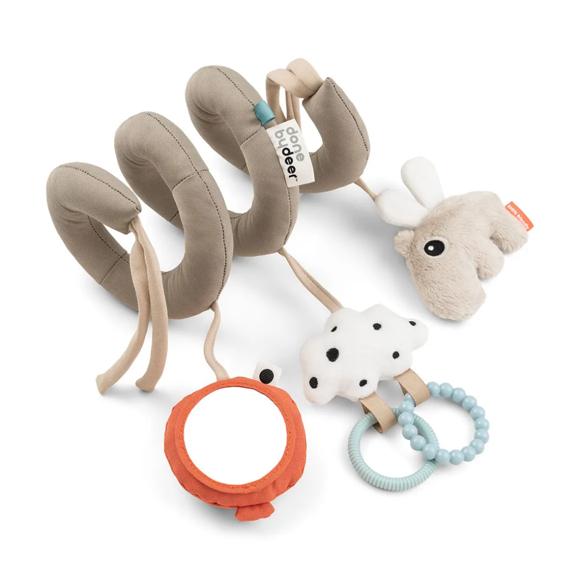 La spirale d’activités Happy Clouds est le jouet idéal pour aller à l’extérieur, plein d’éléments sensoriels à explorer pour votre enfant. Le jouet pour bébé peut être fixé au lit, au siège auto, à la poussette ou au landau à l’aide des ficelles souples.