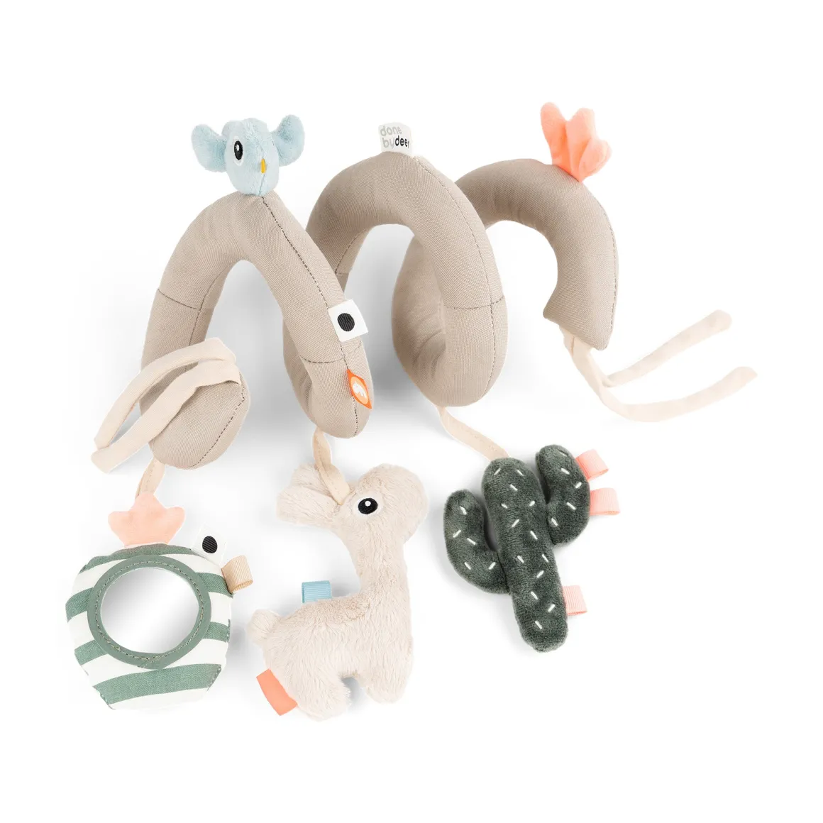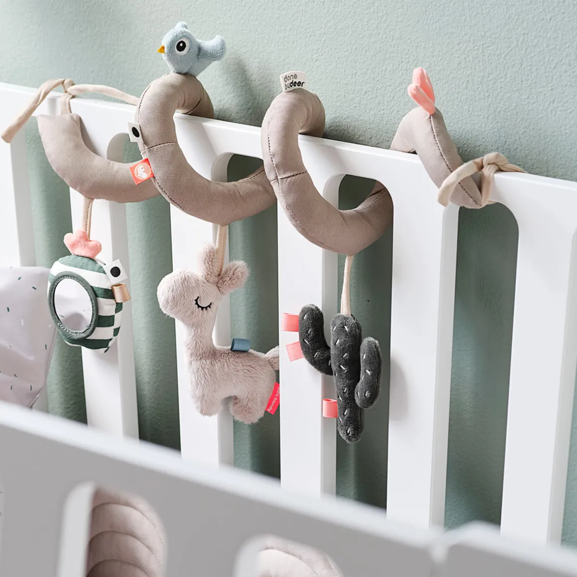 La spirale d’activités avec notre Deer friend Lalee est l’outil d’animation idéal pour aller de l’avant et regorge de fonctions sensorielles à explorer pour votre enfant. La spirale d’activité pour bébé peut être fixée au lit, au siège auto, à la poussette ou au landau à l’aide des ficelles souples.