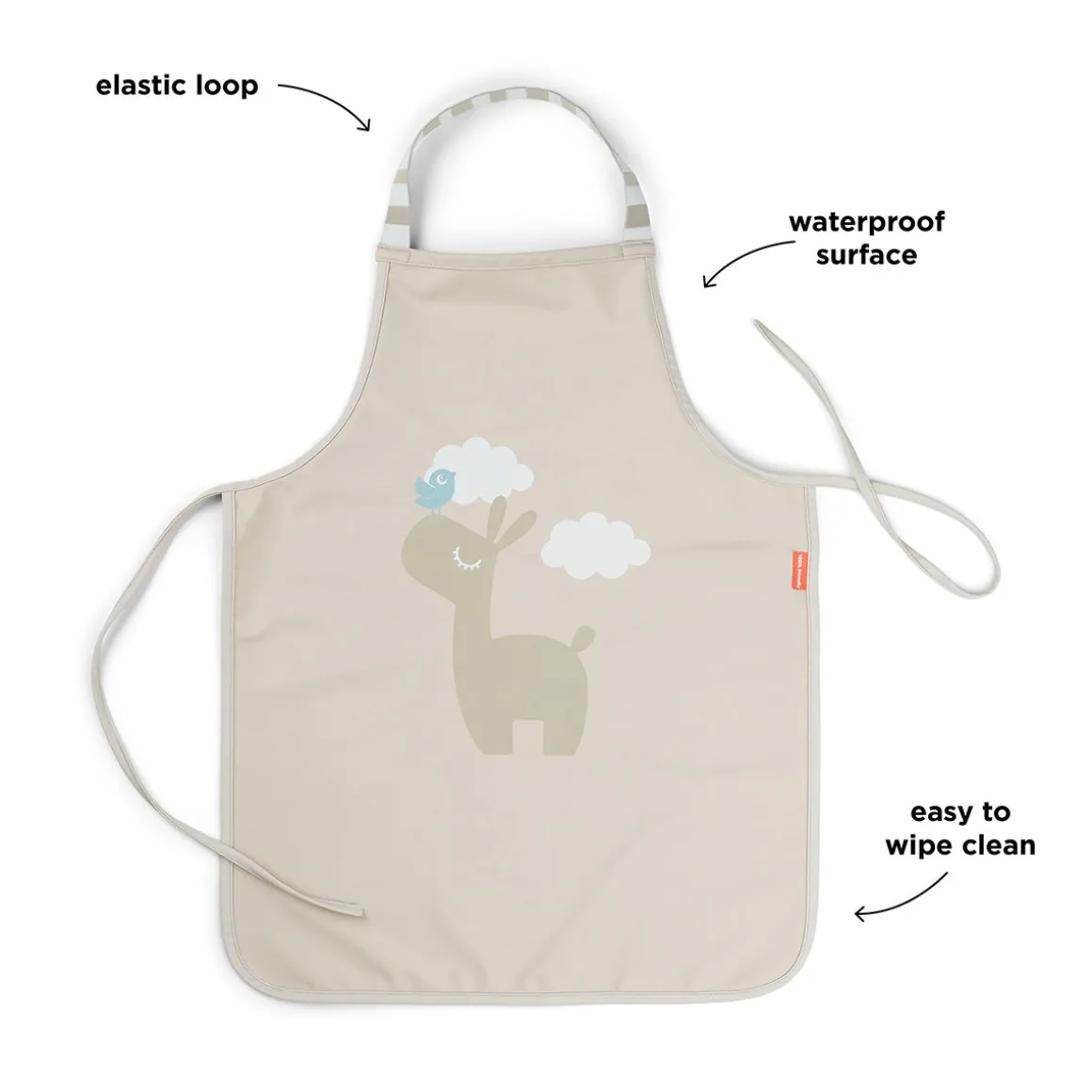 – La boucle élastique au niveau du cou permet aux tout-petits d’enfiler et d’enlever le tablier tout seuls
