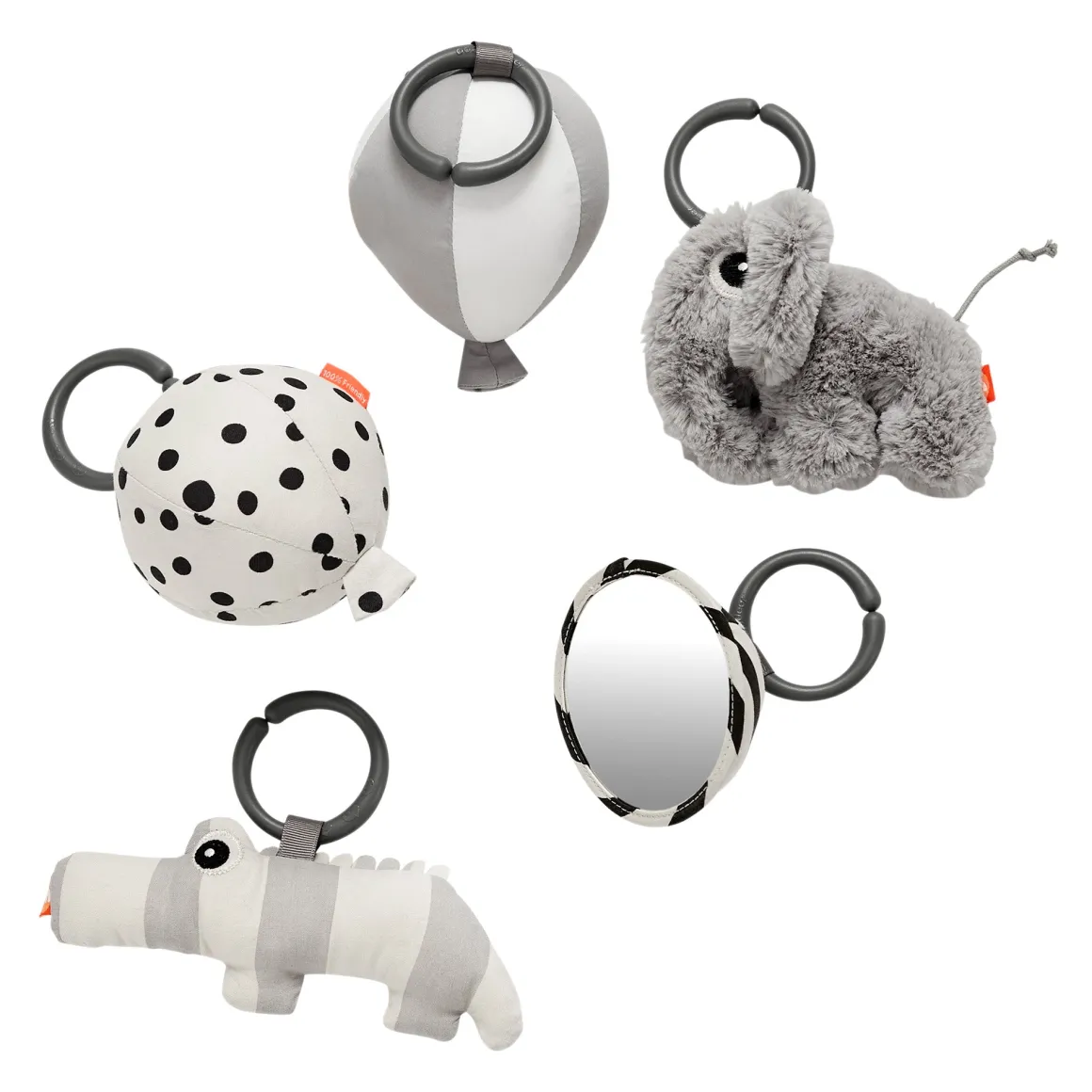 Accrochez les jouets dans 13 positions différentes sur les arches. Croco crépite lorsqu’on le touche, Elphee hochet, le petit miroir sourit en retour et les ballons contiennent un carillon et une clochette – tout cela pour l’éveil de votre bébé.